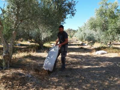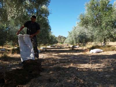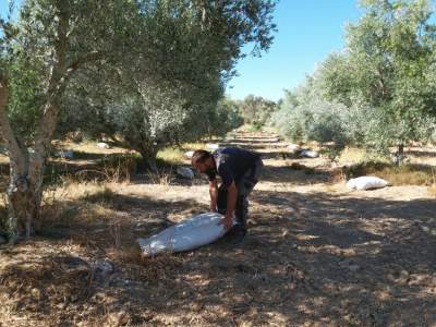 Then, I transport the sacks to the first chosen olive grove and place them at the feet of my olive trees.